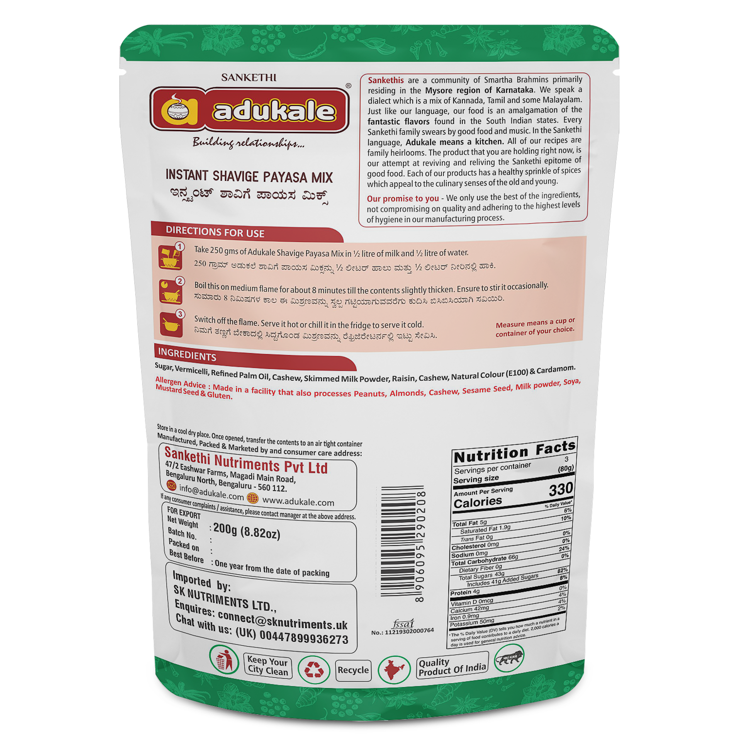 Experience the convenience of instant preparation while savoring the traditional flavors of Shavige Payasa. Adukale's Instant Shavige Payasa Mix is your perfect companion for creating a delicious, aromatic, and creamy dessert effortlessly. Enjoy the sweet moments with Adukale, bringing tradition and taste to your table.